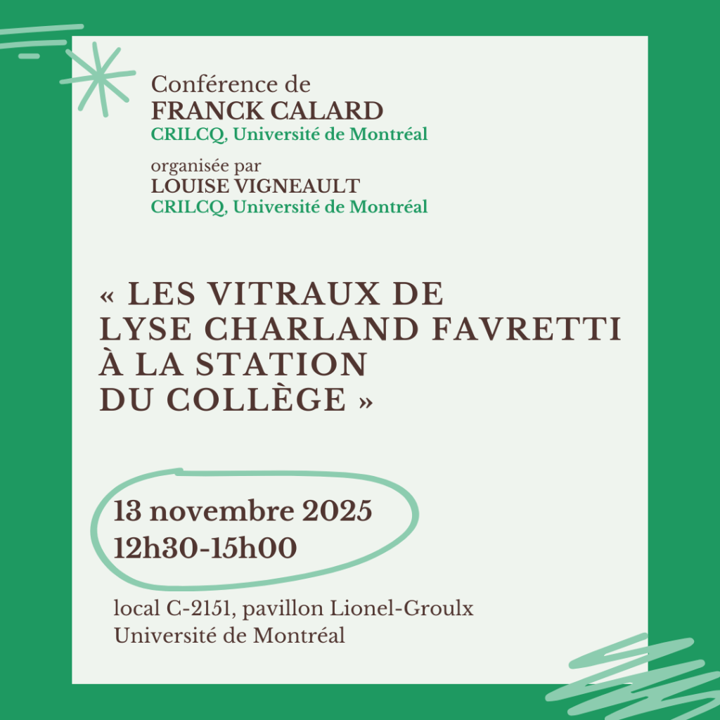 Le 13 novembre 2025, je donnerai une conférence intitulé « Les vitraux de 𝐋𝐲𝐬𝐞 𝐂𝐡𝐚𝐫𝐥𝐚𝐧𝐝 𝐅𝐚𝐯𝐫𝐞𝐭𝐭𝐢 à la station Du Collège », dans le cadre du séminaire « Arts et cultures des Amériques – L’art dans le métro de Montréal : humaniser et dynamiser l’espace », sous la responsabilité de Louise Vigneault, professeure titulaire à l’Université de Montréal et cochercheuse au Centre de recherche interuniversitaire sur la littérature et la culture au Québec (CRILCQ).